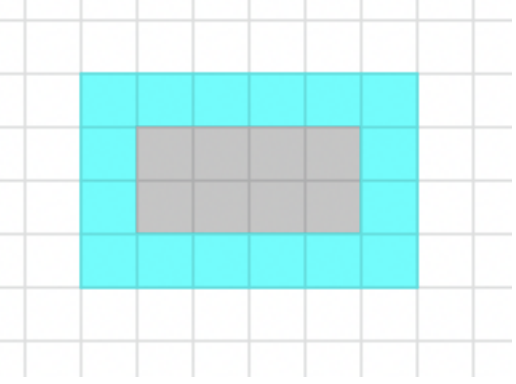На малюнку зображено прямокутник з висотою ~n=4~ та шириною ~m=6~. Клітини, що знаходяться на межі, розфарбовані в голубий. Площа таких клітин — ~16~.