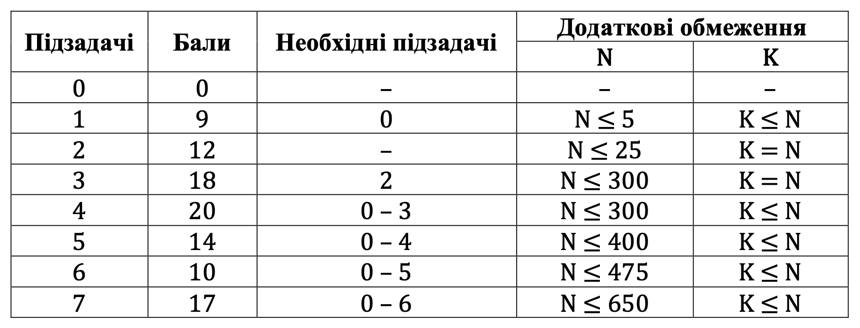 Бали за кожну підзадачу нараховуються за умови проходження усіх тестів підзадачі, залежності від підзадач немає.